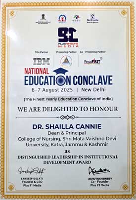 Milestones & Accolades The Ultimate Flex National Florence Nightingale Award Highest National Award in Nursing in India (Nursing Education Category) Conferred by the Hon'ble President of India for over two decades of excellence and service Global Creds Global Nursing Leadership Policy Institute, Geneva, Switzerland 2017 & 2018: Selected as one of 30 global participants organized by International Council of Nurses. Edu Icon of the Year 2024: at EDU Conclave, ILounge media Distinguished Leadership Award ,2025: Received Distinguished Leadership in Institutional Development Award, National Education Conclave, 91Plus Media in collaboration with IBM, NSDC & Skill India
